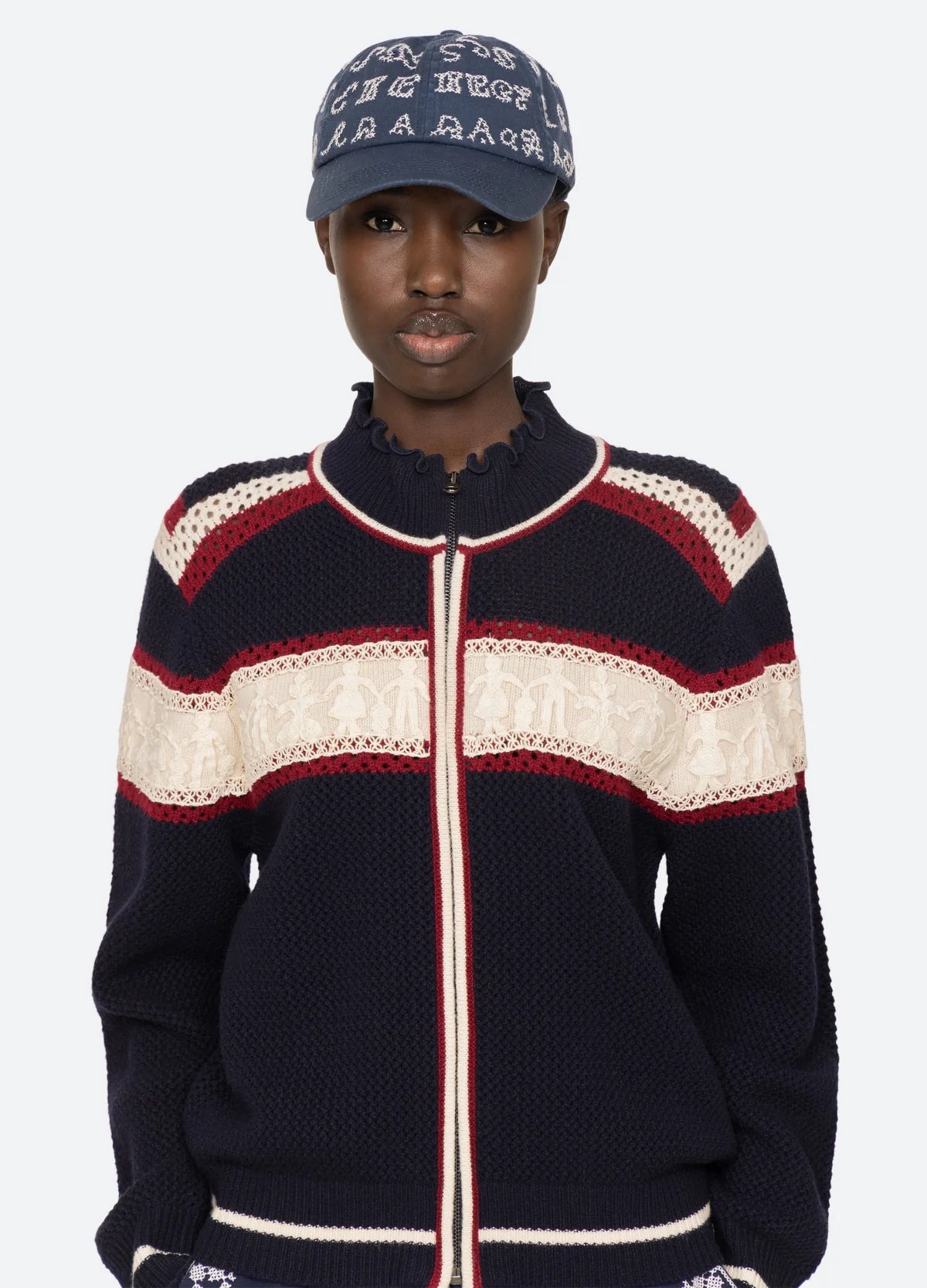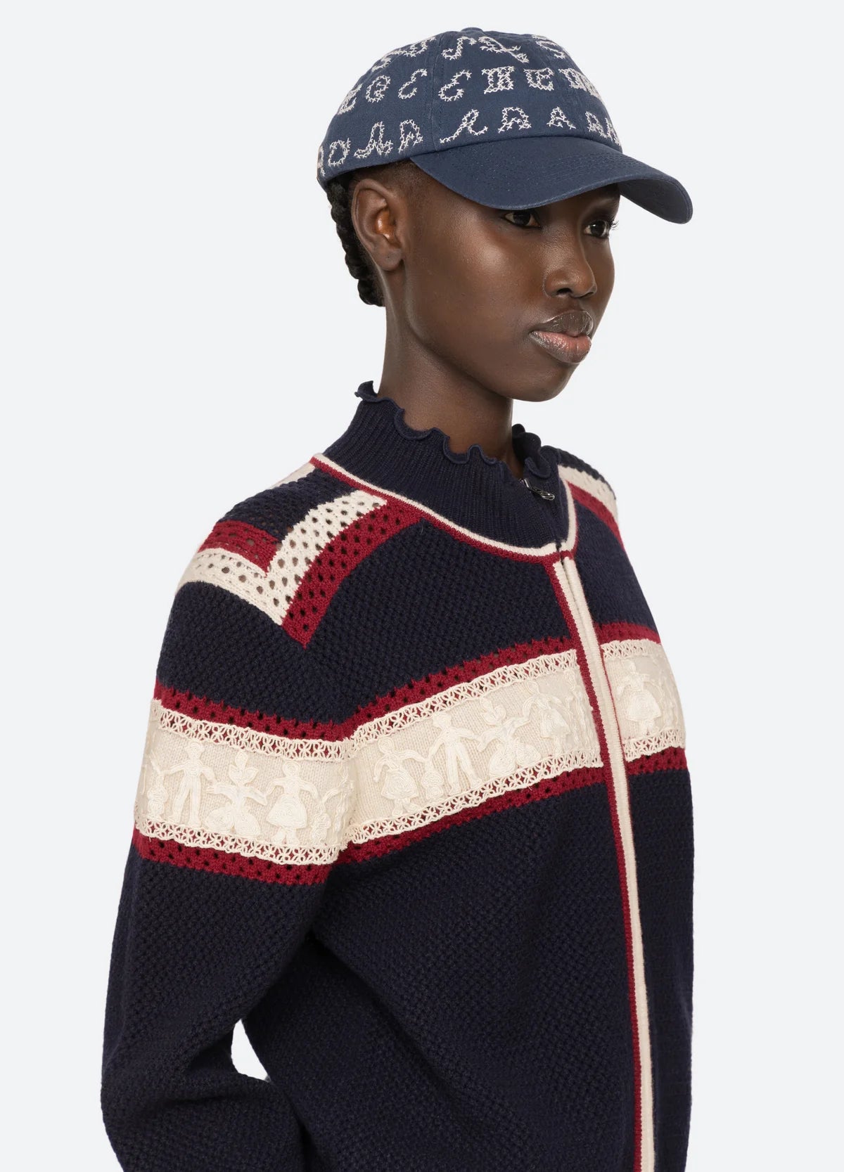 The Kit embroidered hat takes inspiration from vintage embroidery with sampler-style motifs. This piece blends nostalgic craftsmanship with a contemporary, elevated approach to casual wear.