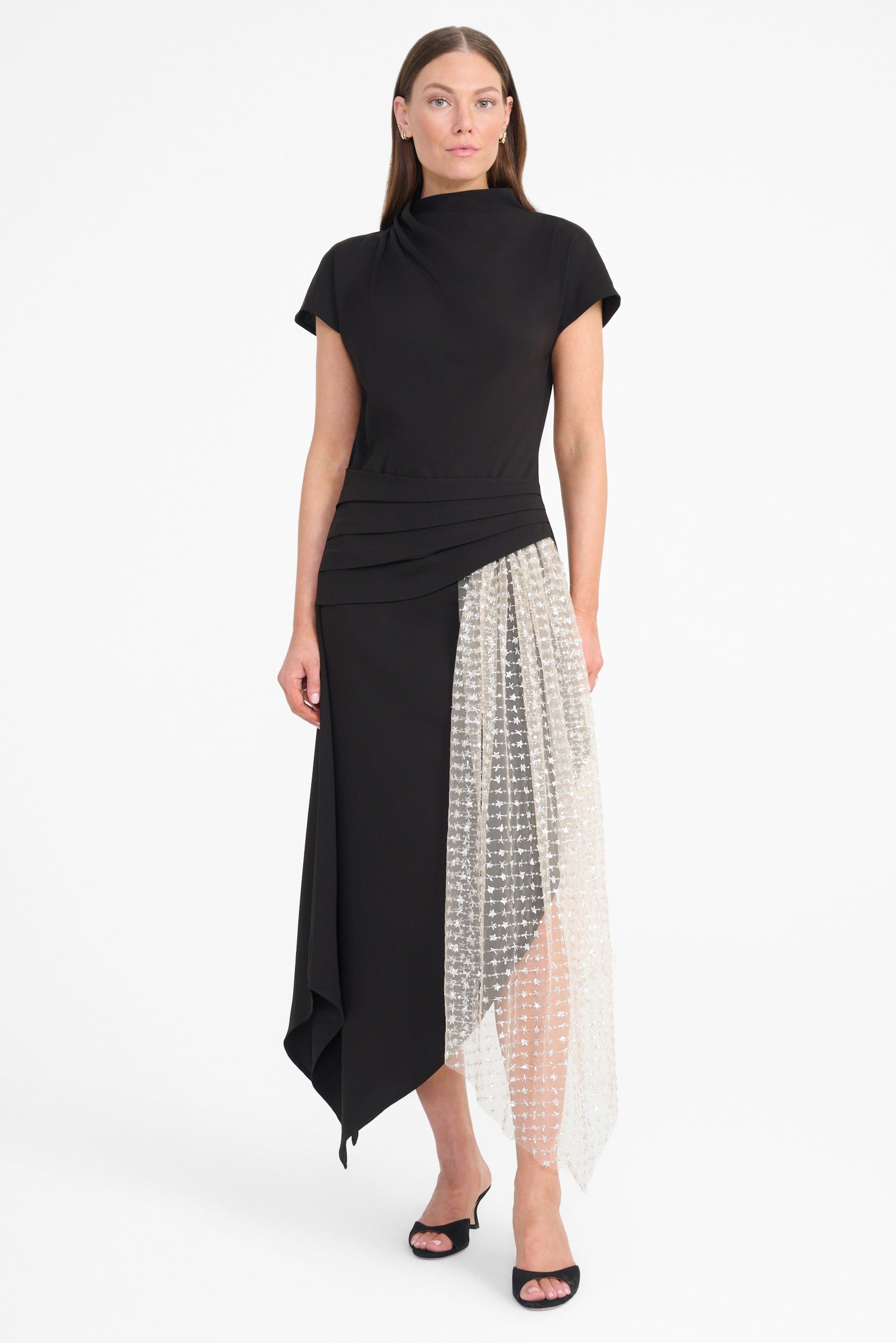 Featuring a draped cowl-neck crepe bodice, the 'Effie' dress has a pleated satin waistband that hangs over an asymmetric-cut skirt and beaded tulle panel.